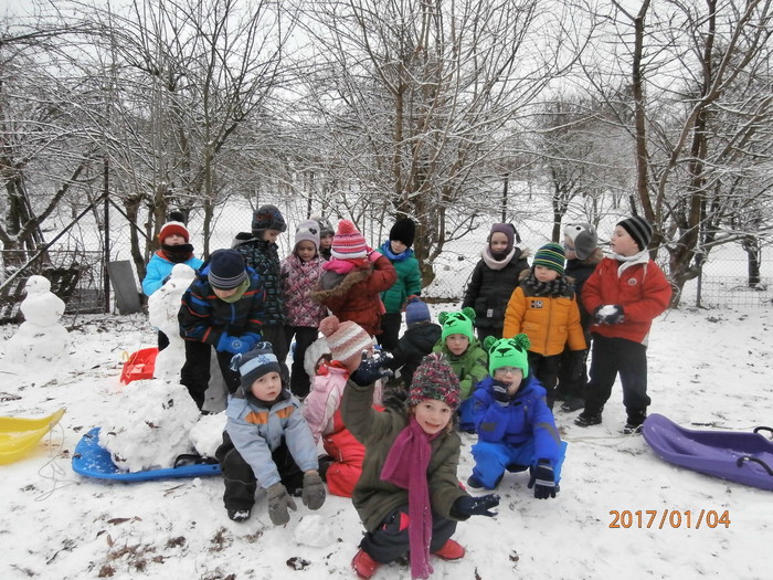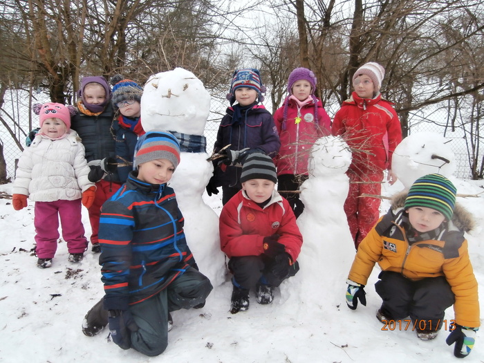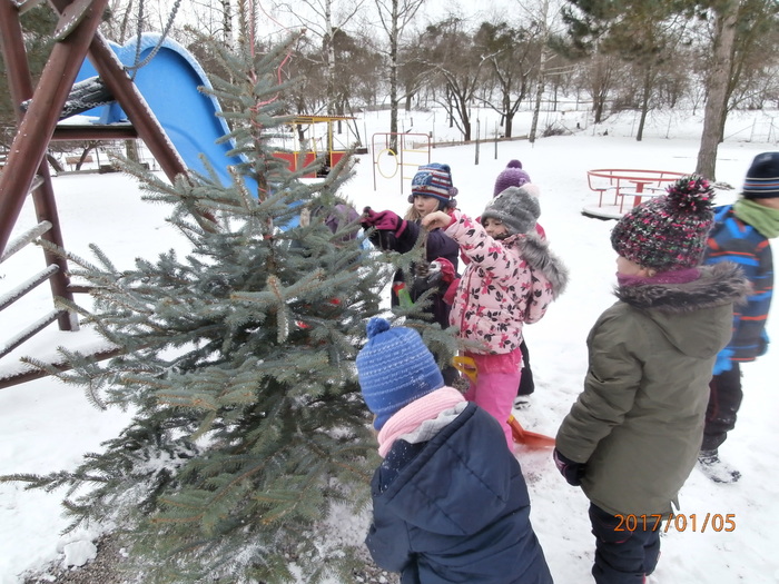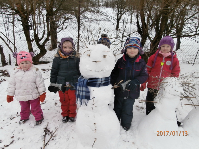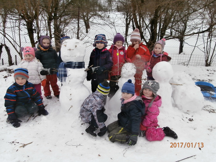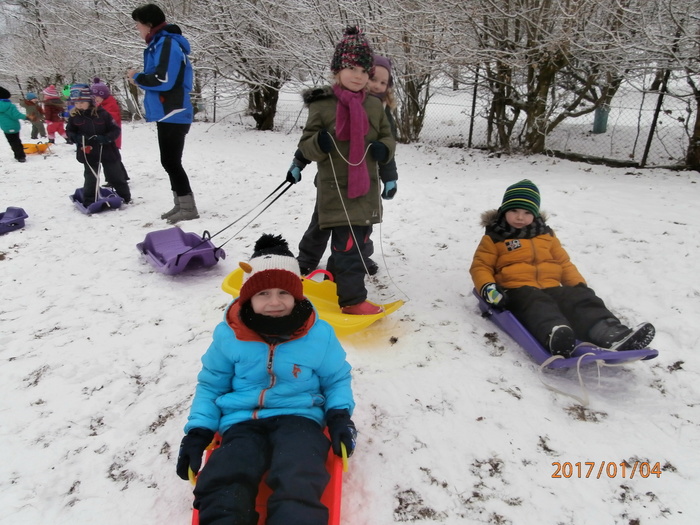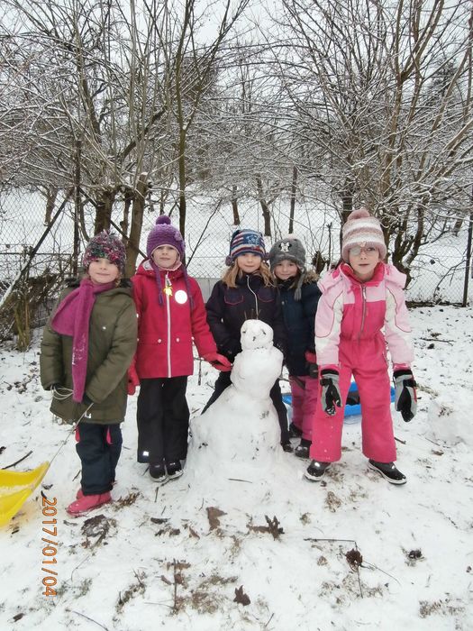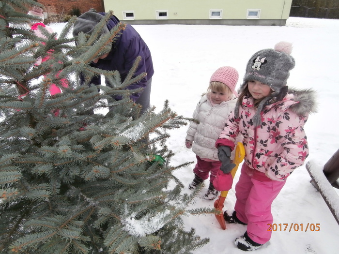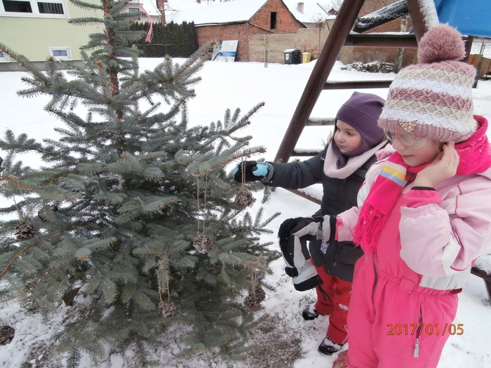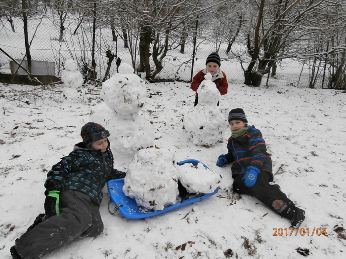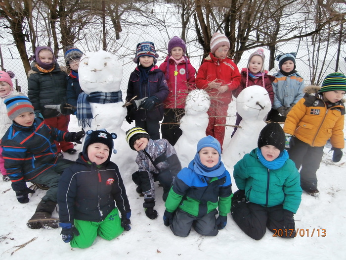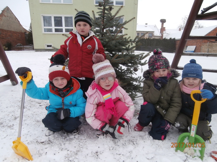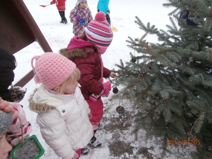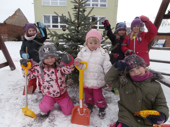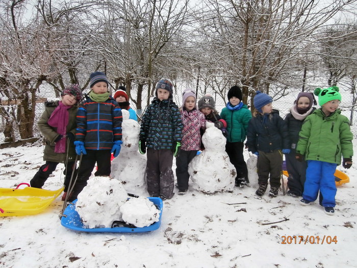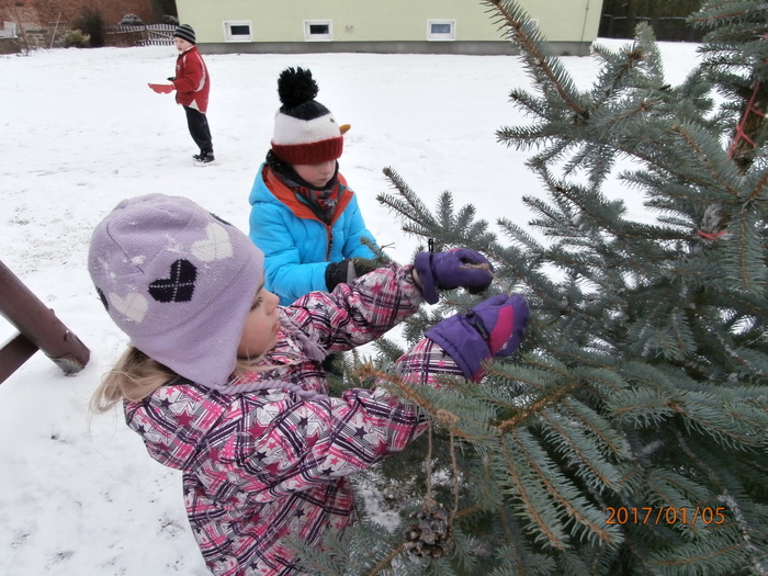 Hned po Vánocích jsme se dočkali větší sněhové nadílky a mohli konečně vytáhnout boby. To bylo radosti! Bobovali jsme, dělali různé sněhové tunely, koulovali se. Sníh stačil dokonce i na několik sněhuláčků. Ptáčkům jsme ozdobili stromeček, který nám ve školce dosloužil, vlastnoručně vyrobenými dobrotami.