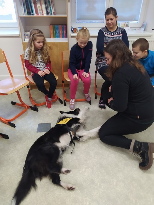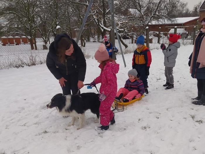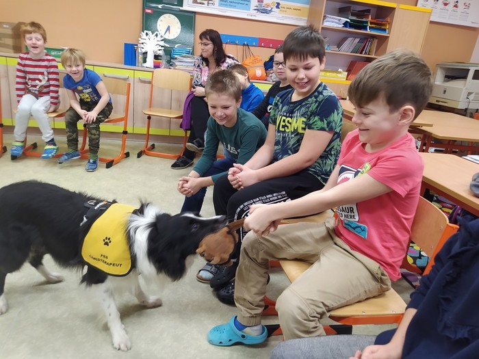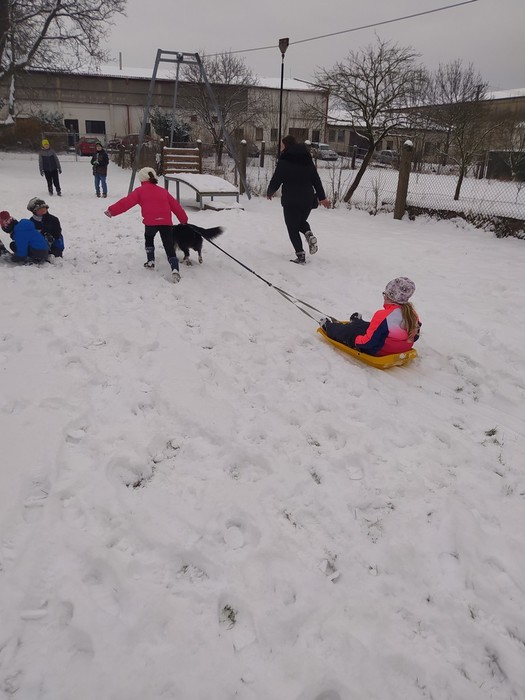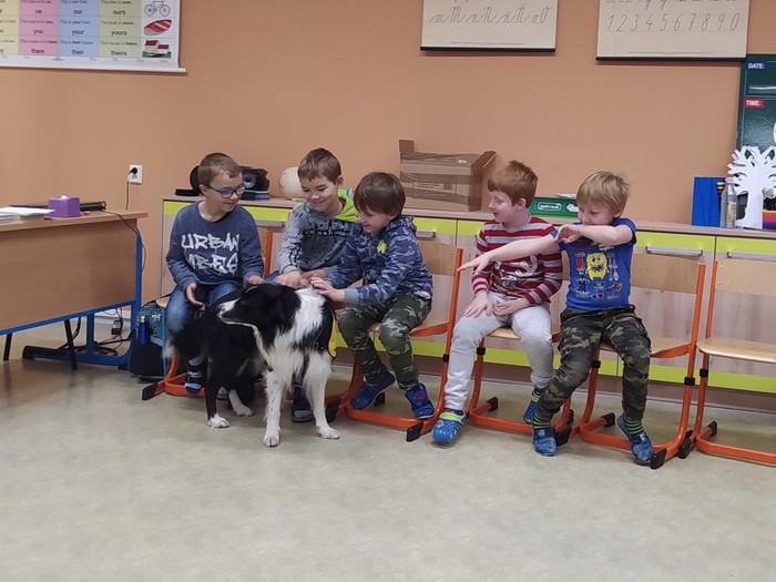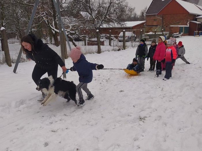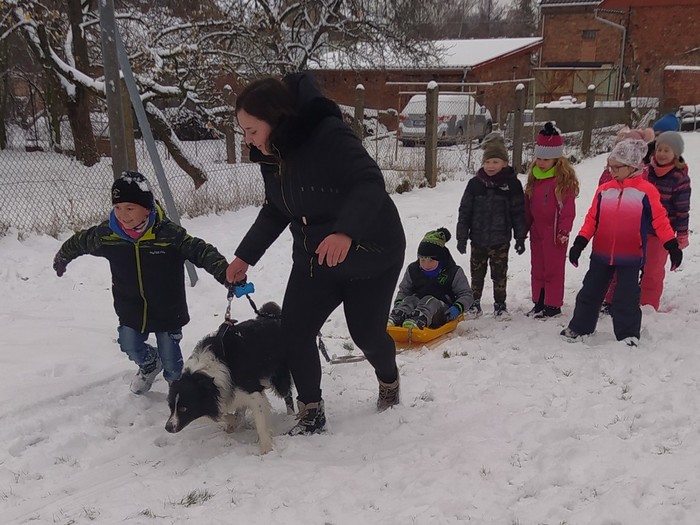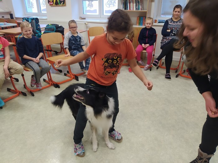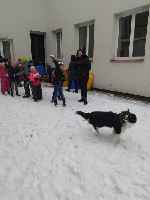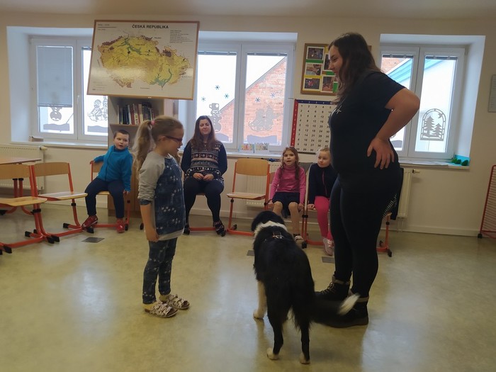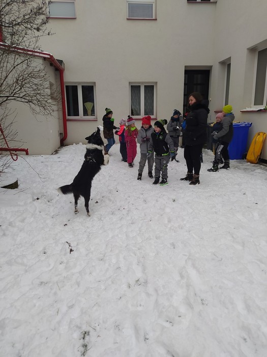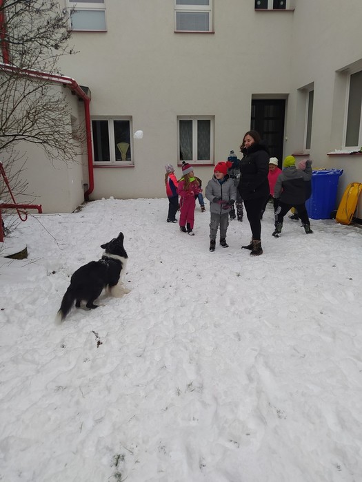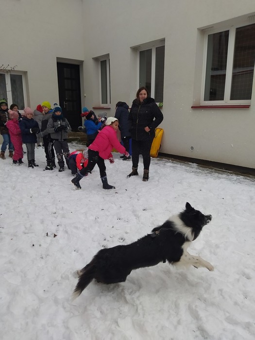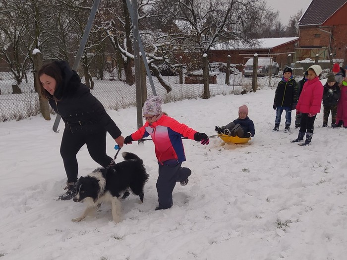 Ve čtvrtek 15. 12. 2022 si žáci užili velmi speciální den se speciální návštěvou. Do školy přijel pes-terapeut. Cvičitelka a canisterapeutka sl. Vaňková připravila pro děti se svým psem Dantem dopoledne plné zajímavých triků, cviků a psích dovedností, ale zároveň zábavně poučila žáky, jak se chovat ke psům, jak porozumět jejich řeči a jak se o pejsky správně starat. Každé dítě mohlo být s Dantem v kontaktu, mohlo mu dávat povely a odměňovat ho a hrát si s ním na čerstvém sněhu. Celkově si všichni užili perfektní "psí" dopoledne.