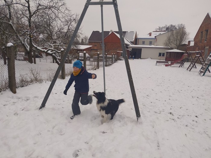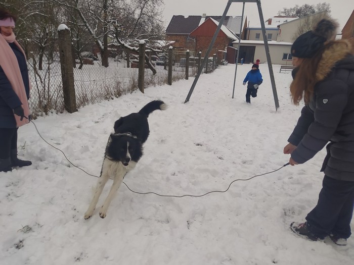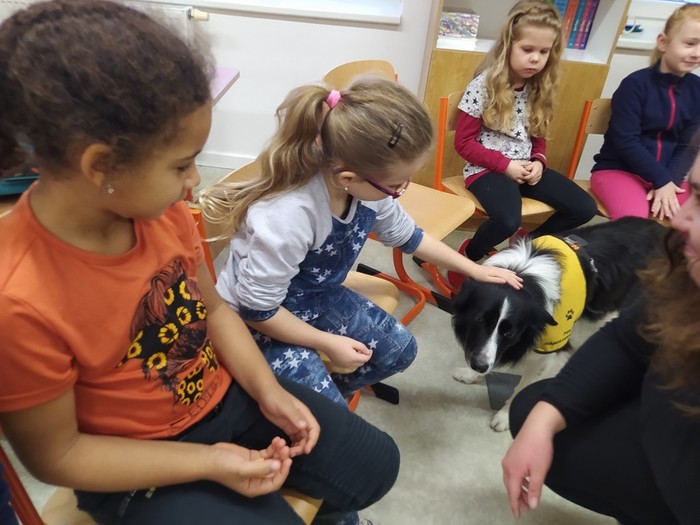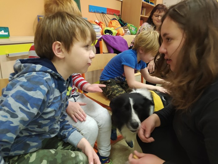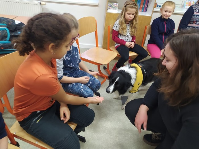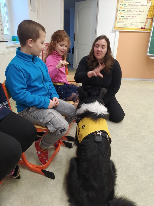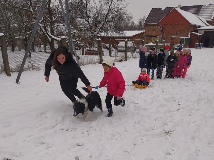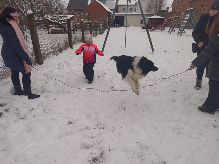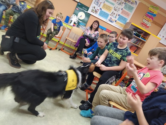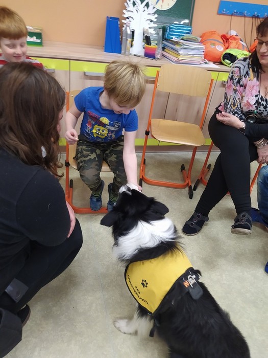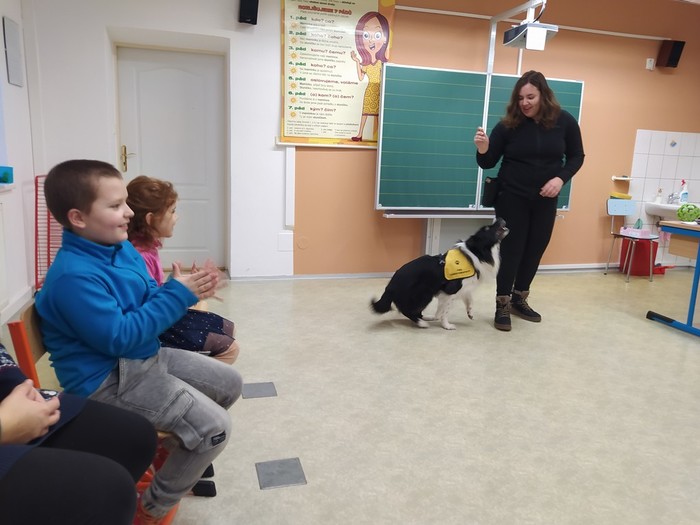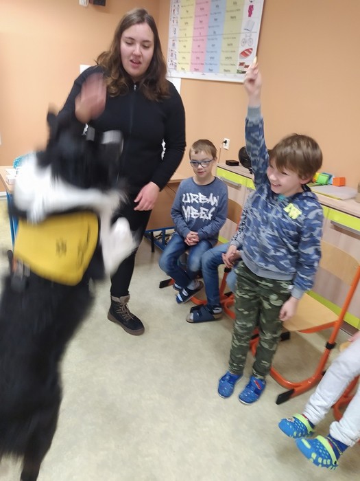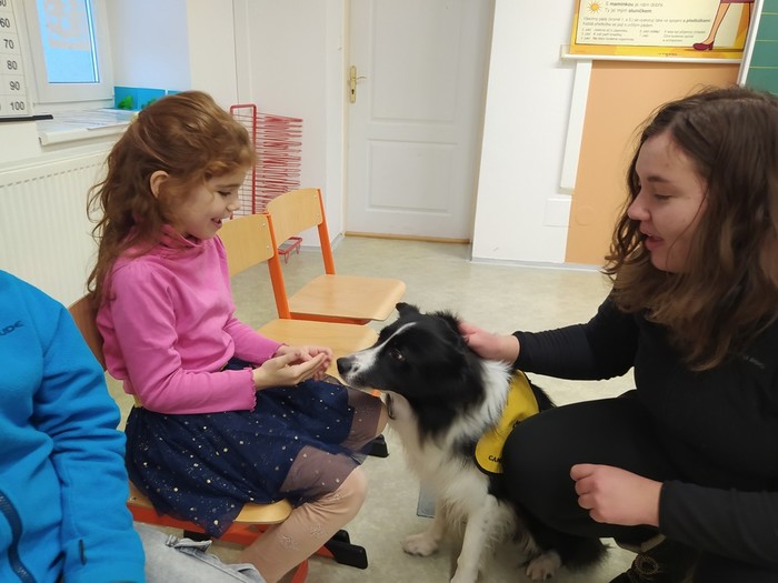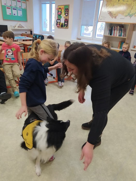 Ve čtvrtek 15. 12. 2022 si žáci užili velmi speciální den se speciální návštěvou. Do školy přijel pes-terapeut. Cvičitelka a canisterapeutka sl. Vaňková připravila pro děti se svým psem Dantem dopoledne plné zajímavých triků, cviků a psích dovedností, ale zároveň zábavně poučila žáky, jak se chovat ke psům, jak porozumět jejich řeči a jak se o pejsky správně starat. Každé dítě mohlo být s Dantem v kontaktu, mohlo mu dávat povely a odměňovat ho a hrát si s ním na čerstvém sněhu. Celkově si všichni užili perfektní "psí" dopoledne.