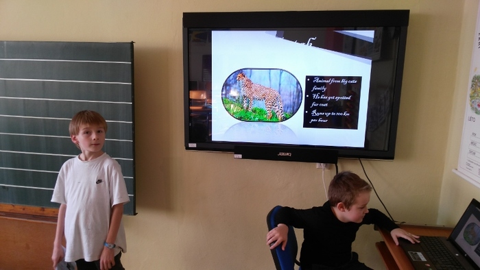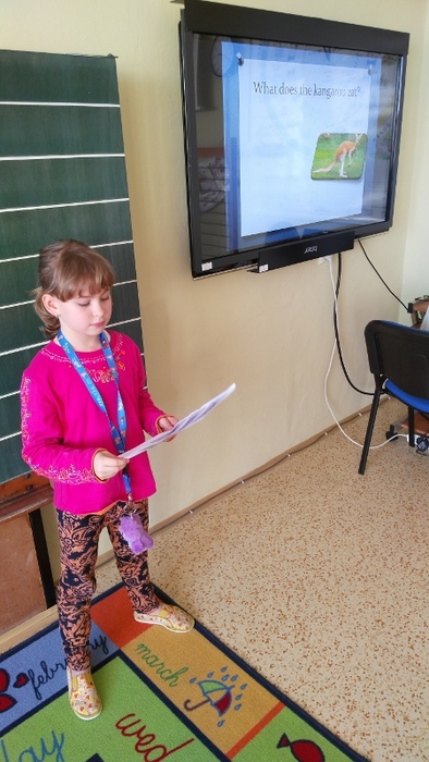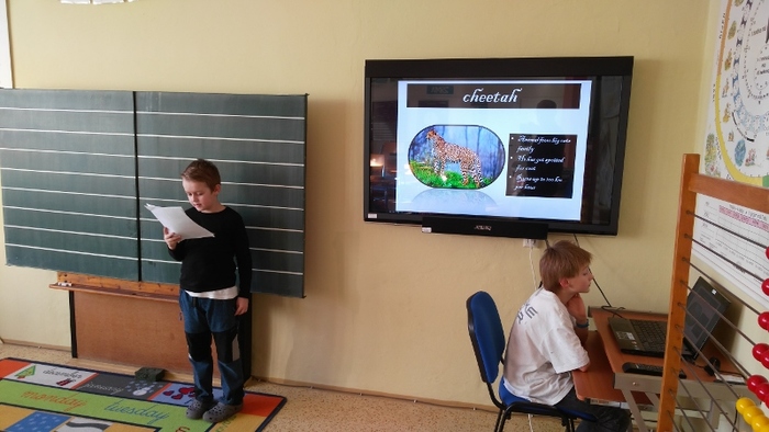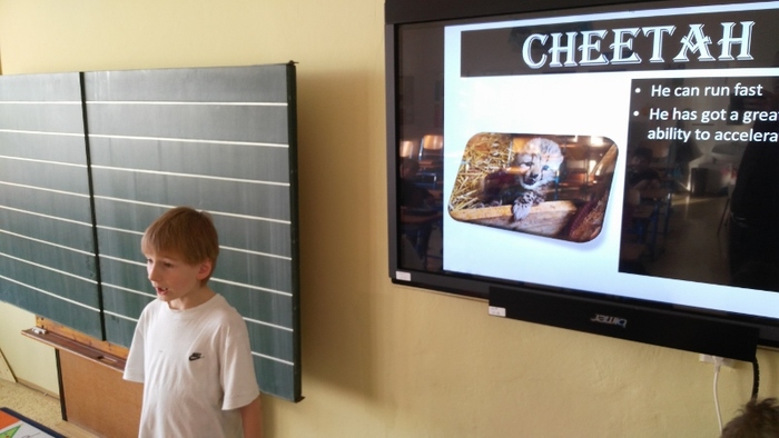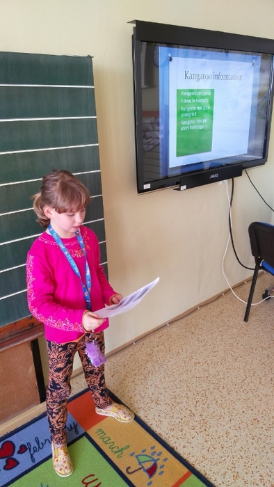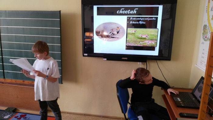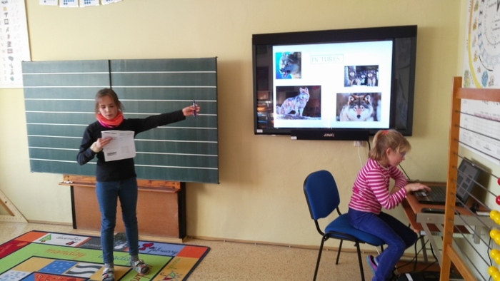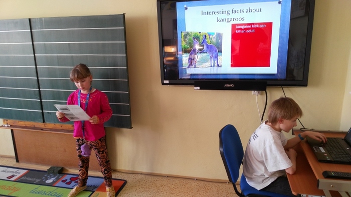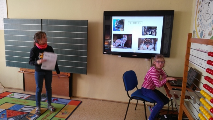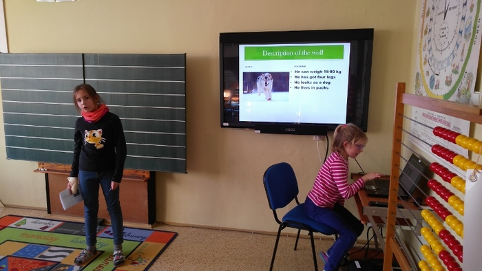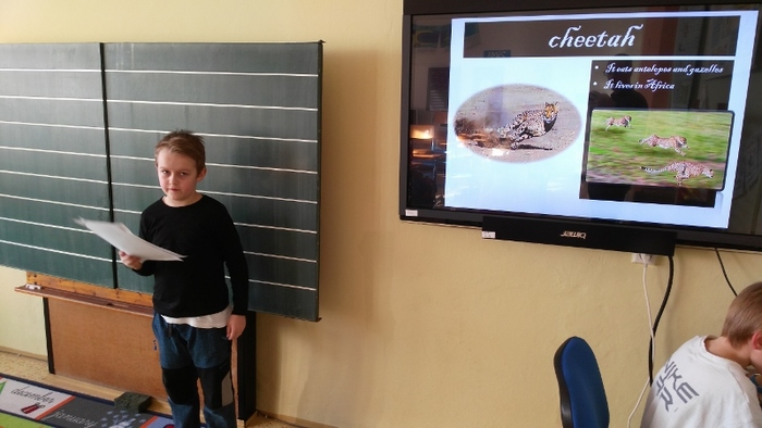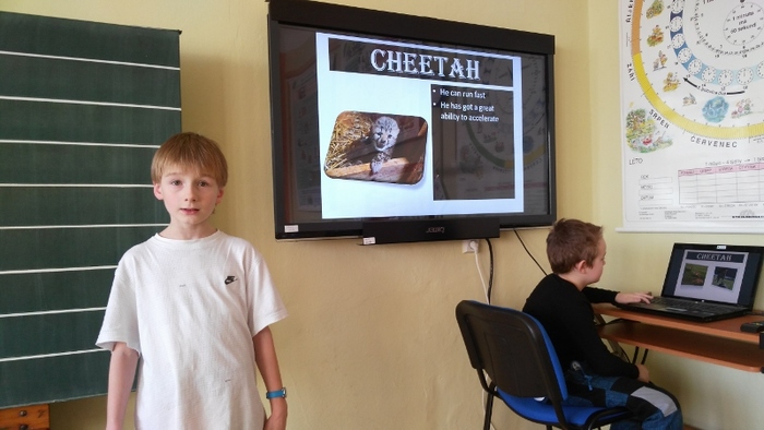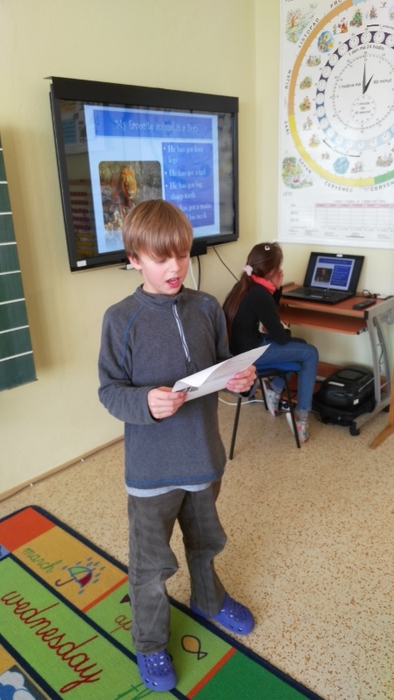 Žáci vytvořili prezentace o svých oblíbených zvířatech - procvičili si vyhledávání fotografií a informací a procvičili tvorbu prezentací včetně animací. Těžší část byla prezentovat své výtvory před spolužáky. Cvičili jsme správnou výslovnost, postoj a jednoduchá gesta.