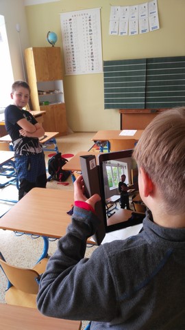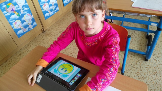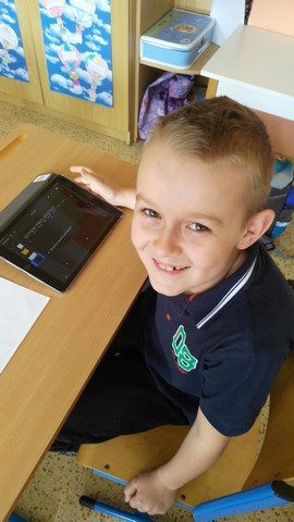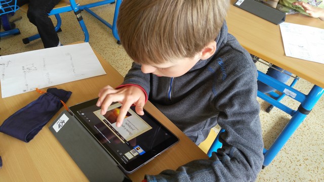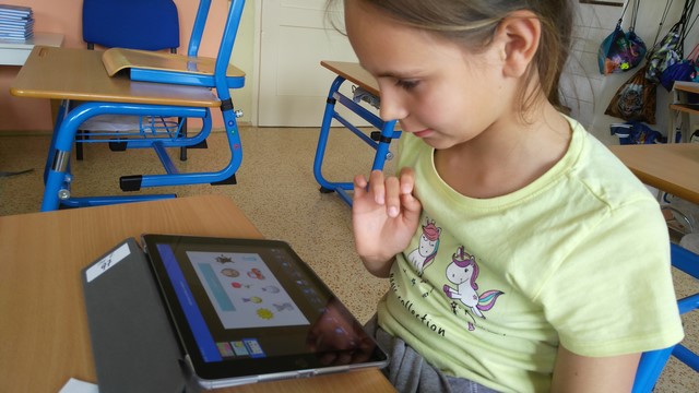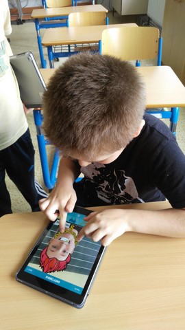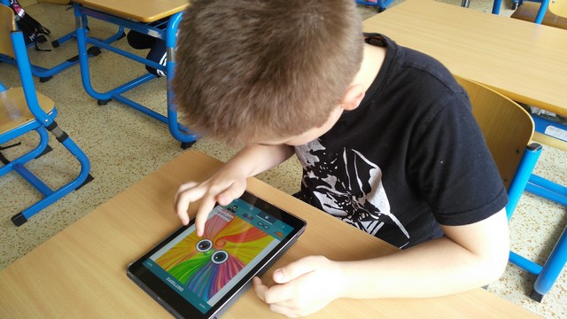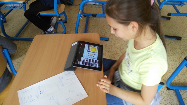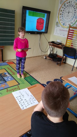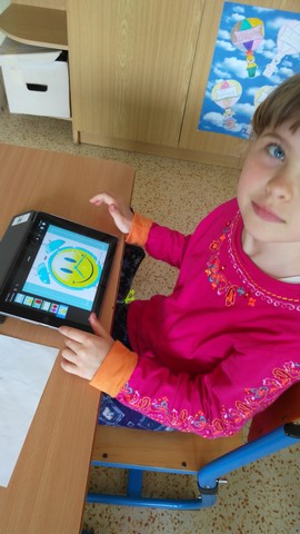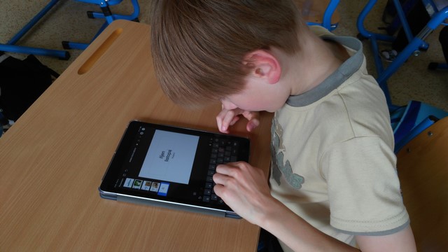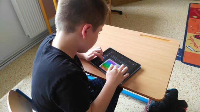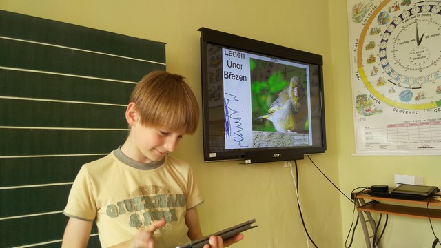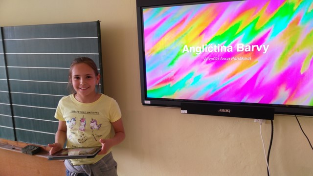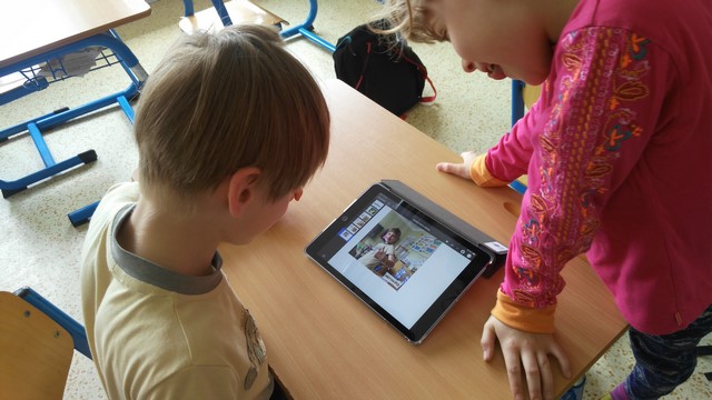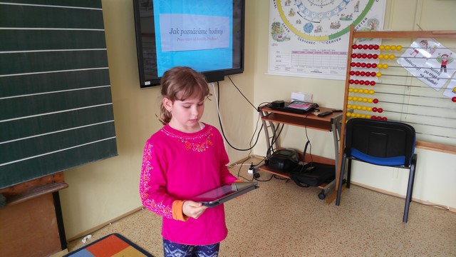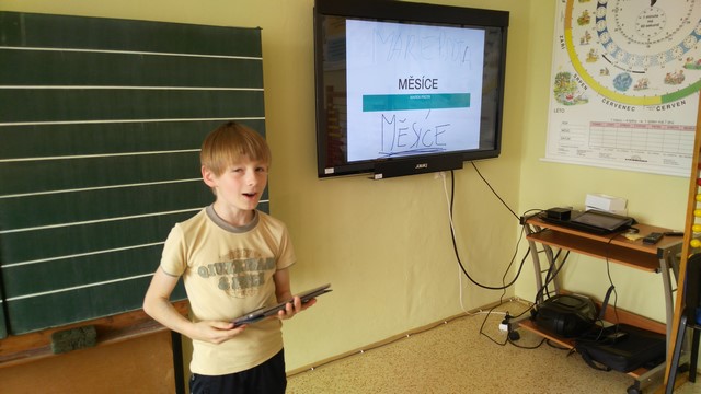 Tentokrát děti využívaly k tvorbě prezentací aplikace na tabletech iPad. Využívaly nejvíce fotoaparát a ořez fotek, aplikaci na tvorbu mluvících obrázků a prezentační aplikace Keynote. Zadáním byla výuková aplikace - dva žáci vytvořili prezentaci do angličtiny o barvách, dva žáci matematický výklad o sčítání přes desítku, Janička nás učila poznávat hodiny a Marek měl prezentaci o měsících v roce.