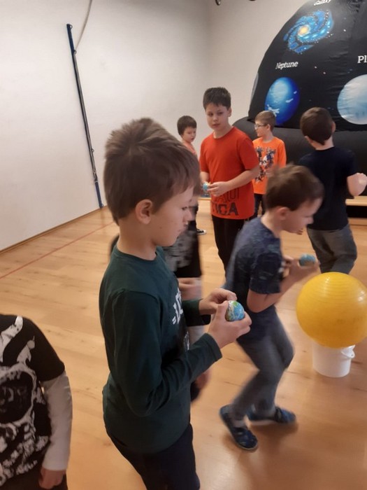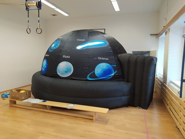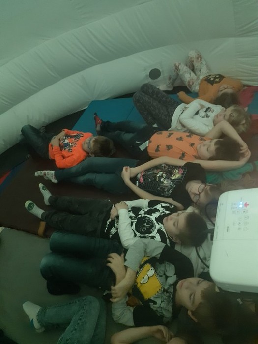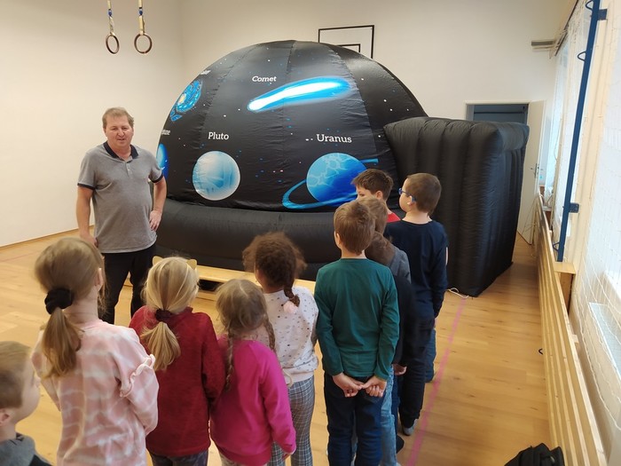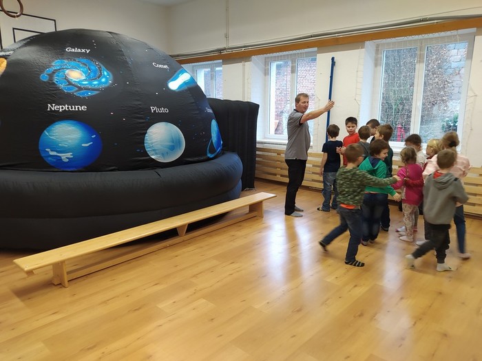 Do školy znovu zavítal zážitkový stan - mobilní planetárium s programy pro předškolní děti a děti mladšího a staršího školního věku. Všichni si užili filmy promítané na kupoli a vesmírné hry v tělocvičně.