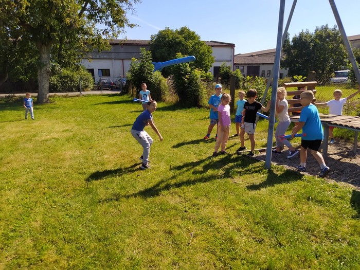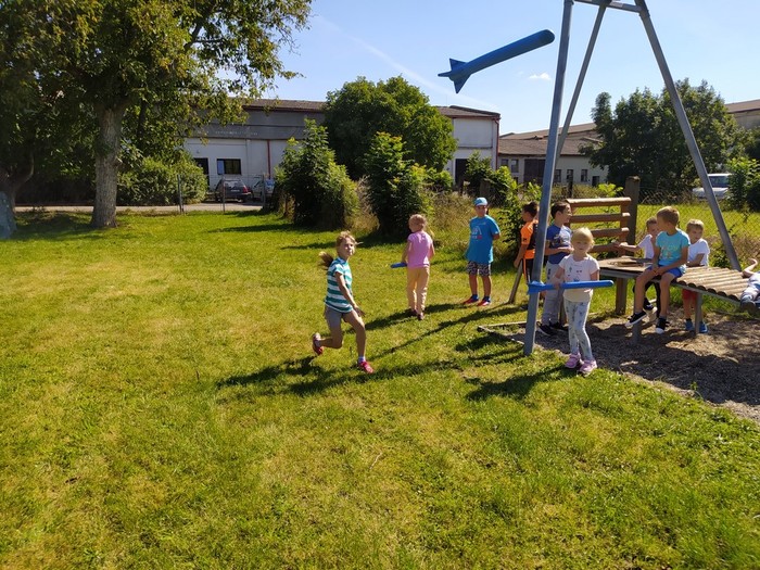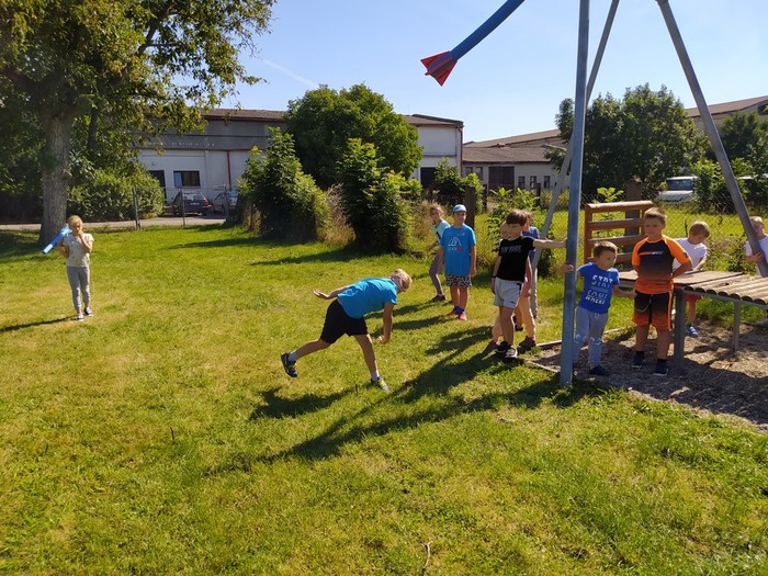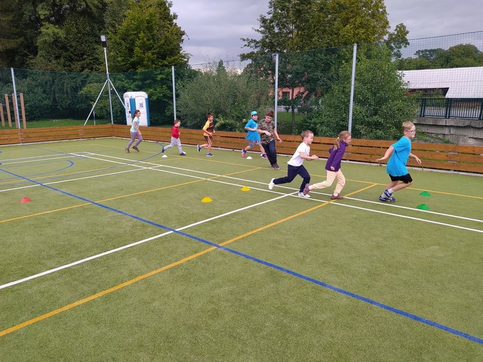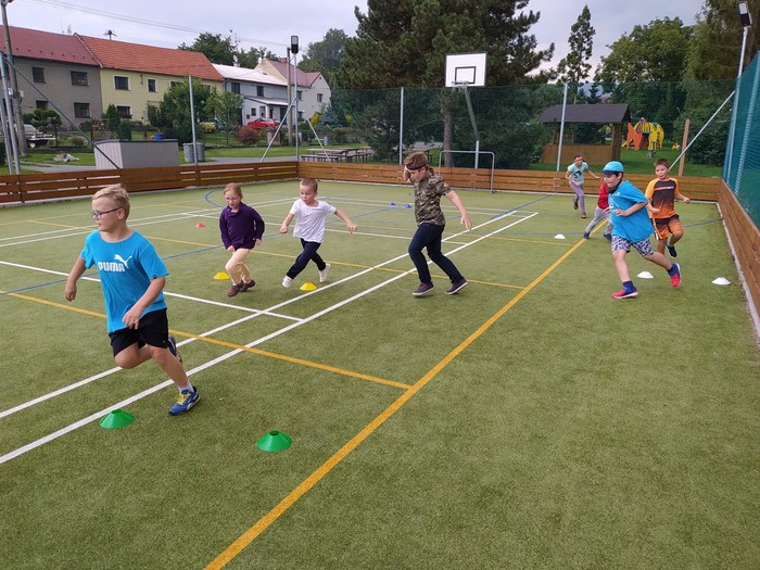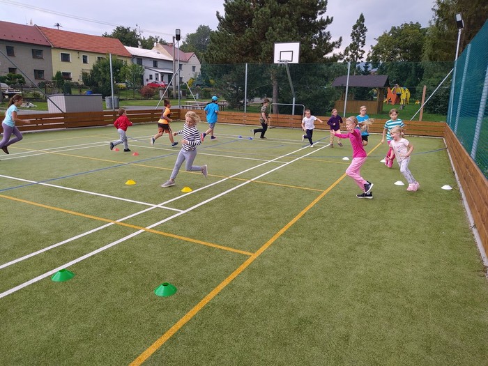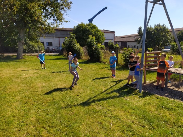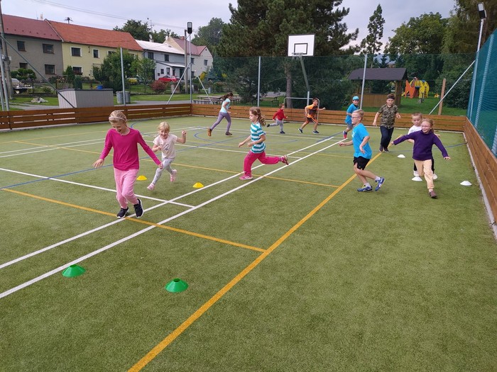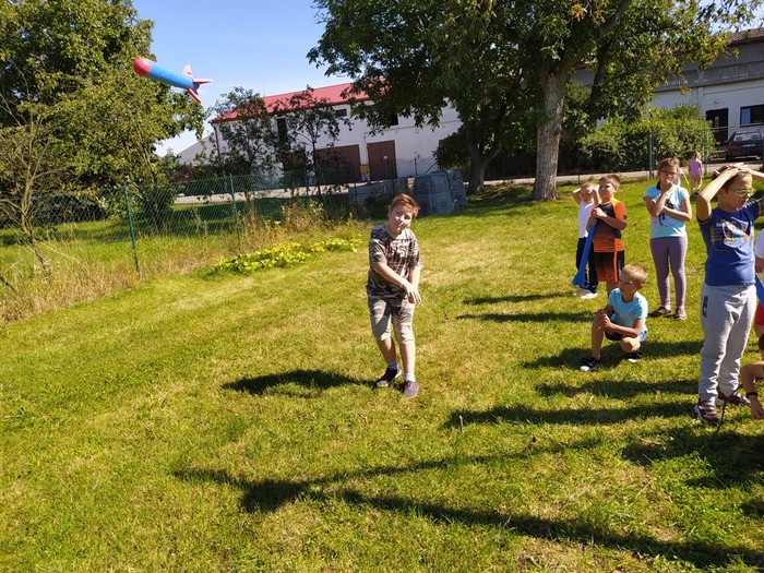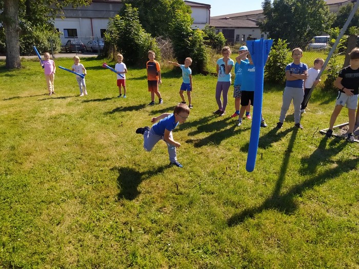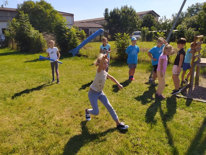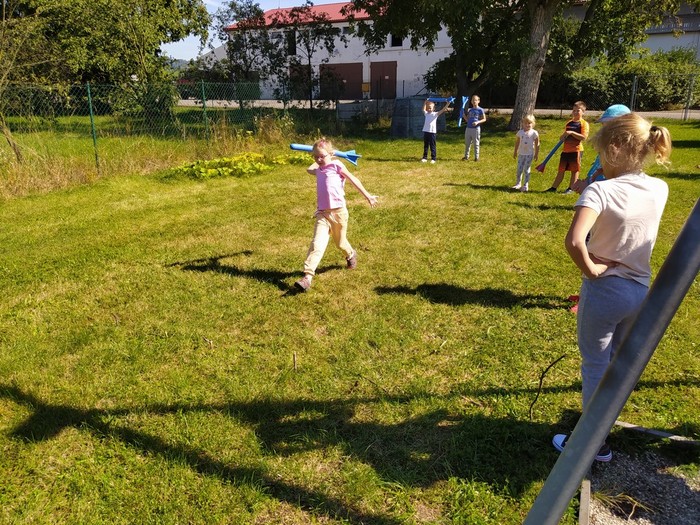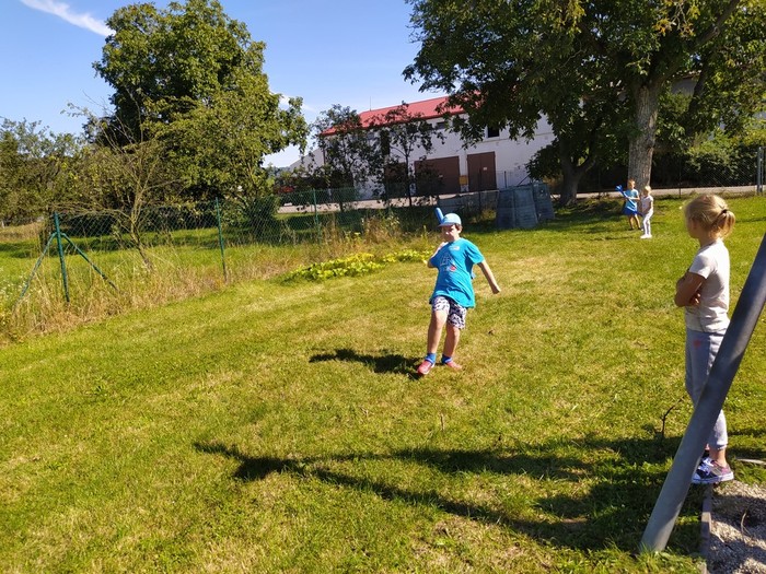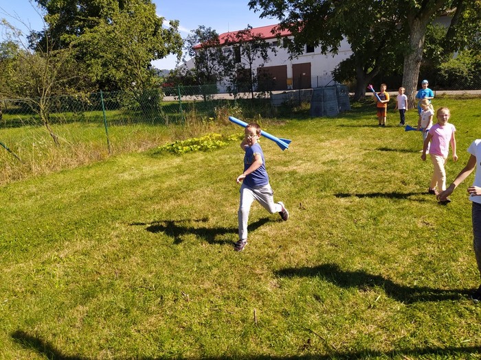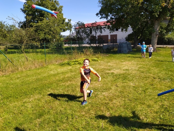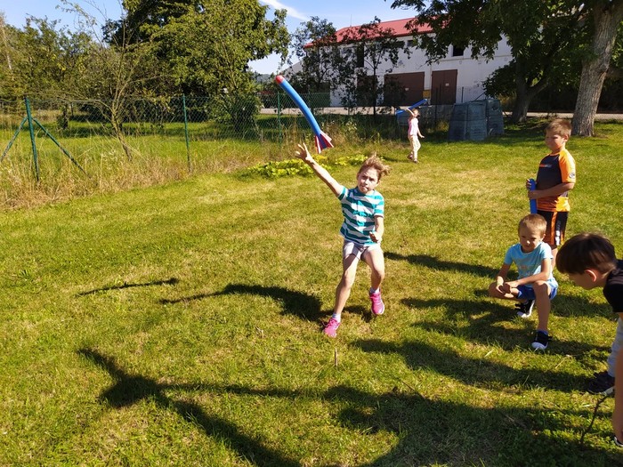 Hod oštěpem (pěnovým) v tělocviku na školní zahradě