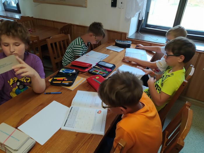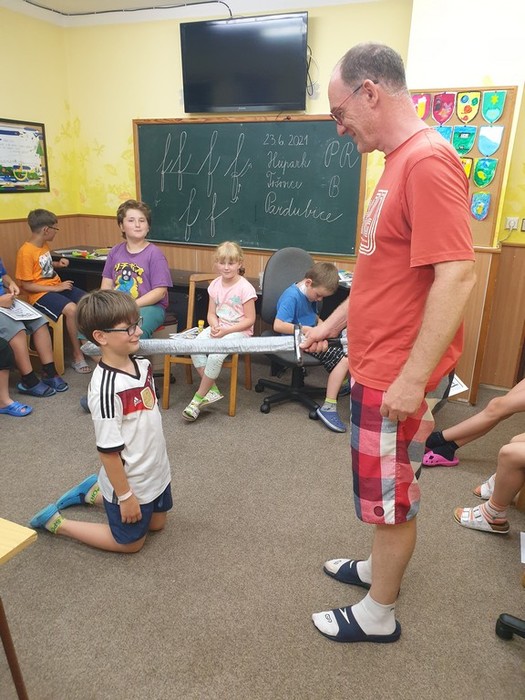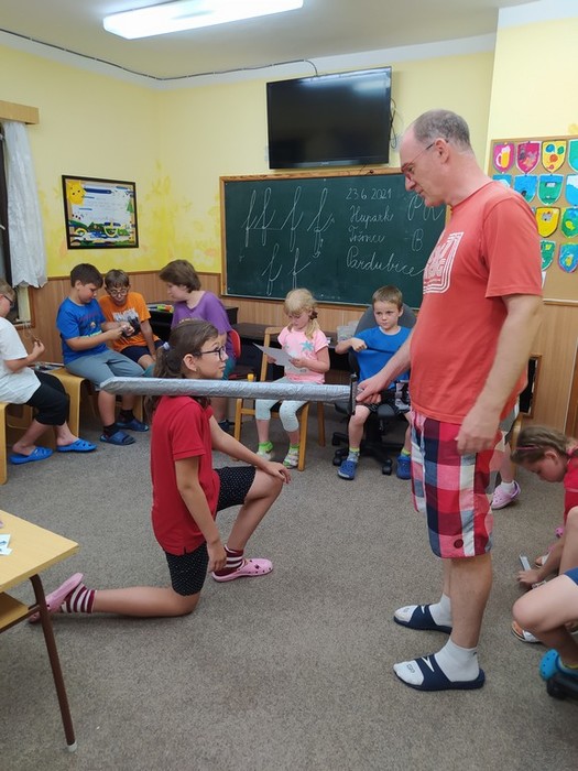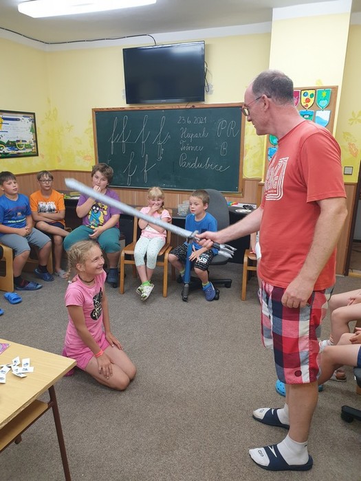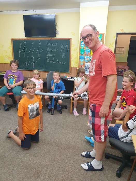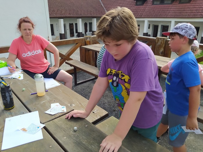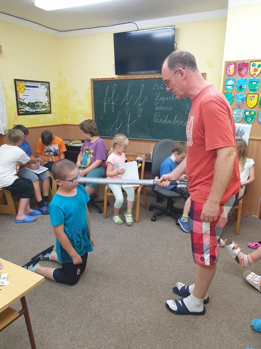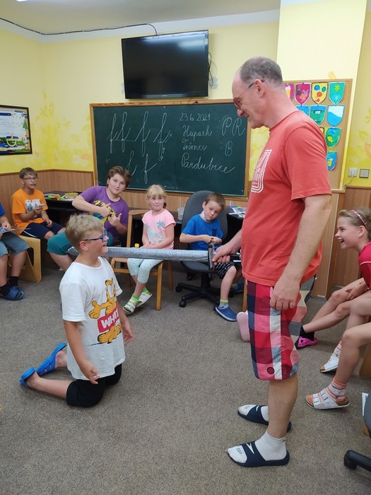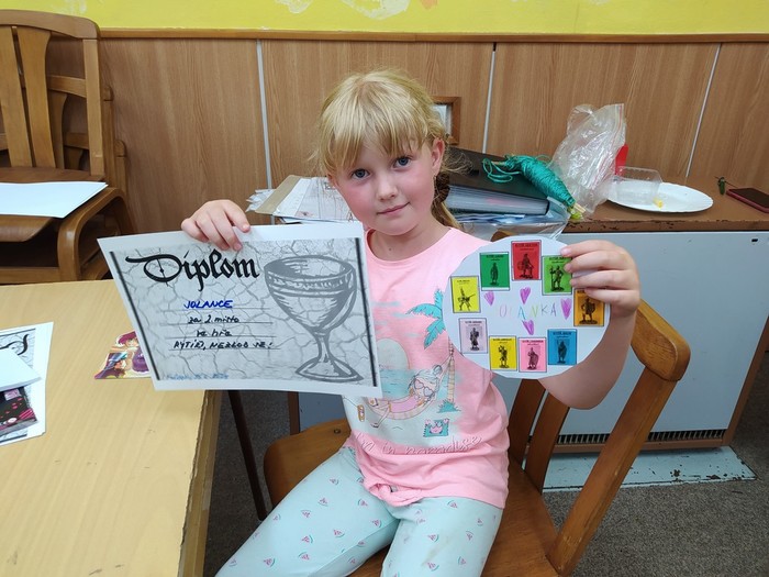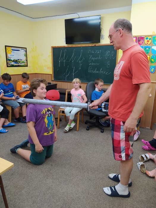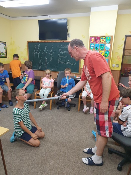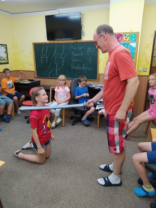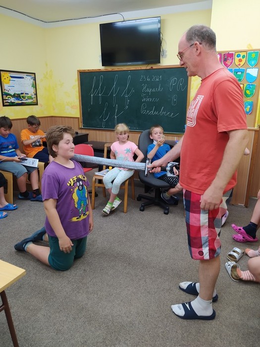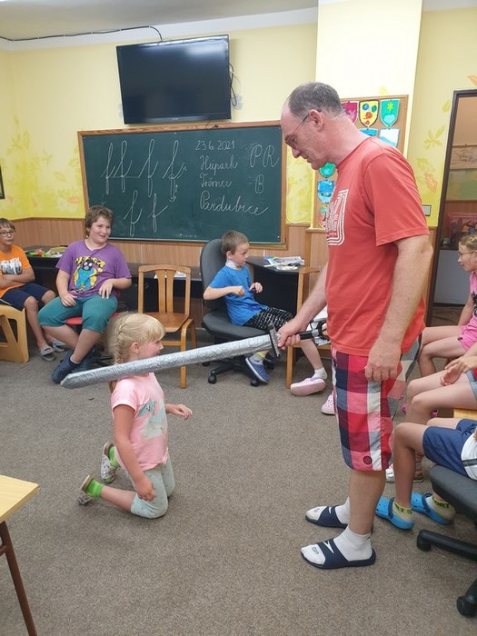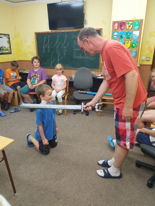 Den 4.: ranní škola - odpolední koupání - hra na trpělivost Rytíři, nezlob se! - večerní kvízy - dokončení cností rytířů kulatého stolu - pasování na rytíře - společné zpívání