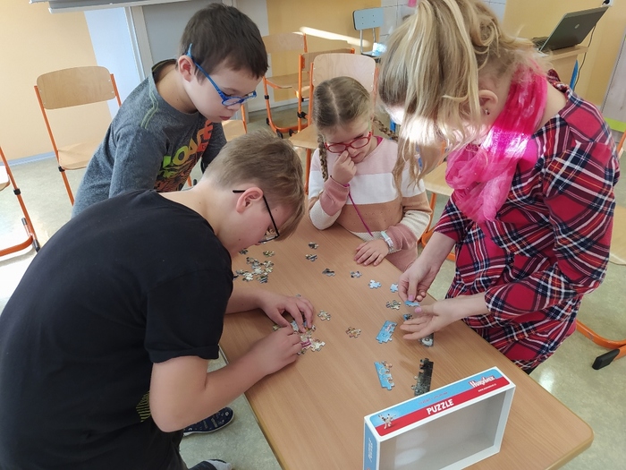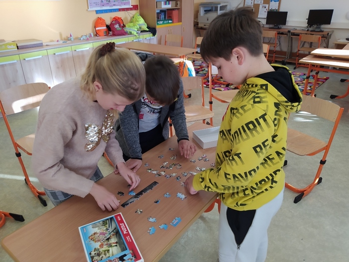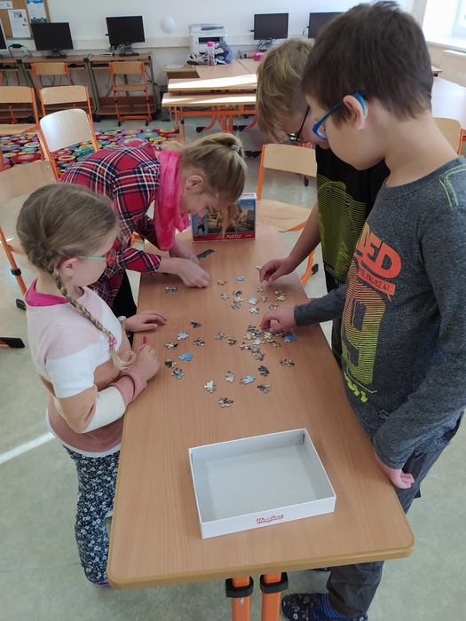 Ve středu 10. 11. proběhl ve škole projektový den zaměřený na schopnost spolupráce, empatie, porozumění, ale také opakování znalostí. Žáci celý den plnili různé logické úlohy, soutěžili ve kvízech a nakonec pátrali po indiciích k hlavní tajence. Uspěli všichni! Přesto někdo musel být nejlepší a tak odznak sv. Martina získala skupinka ve složení Martin, Viktorka, Karolínka a Marek.