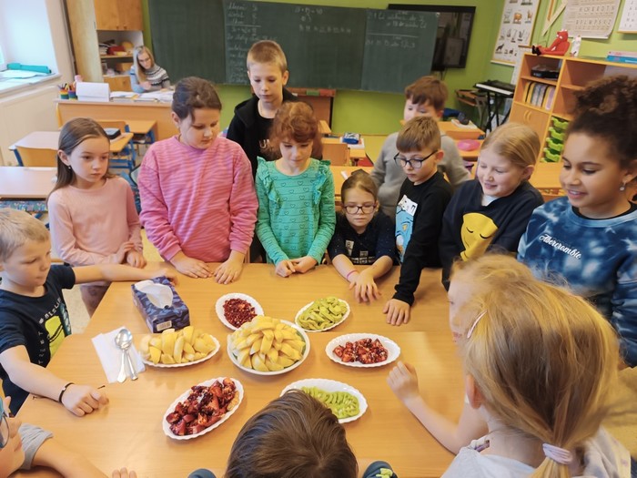 Poslední dva týdny na konci 1. pololetí byly ve znamení prověřování znalostí a dovedností, uvědomění si, co se děti za půl roku naučily a čeho dosáhly. Kromě toho jsme ale také zvládli řadu výukových her, tvoření, výukových aktivit ve skupinkách apod. Došla také ochutnávka cizokrajného ovoce z projektu Ovoce do škol.